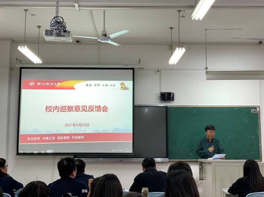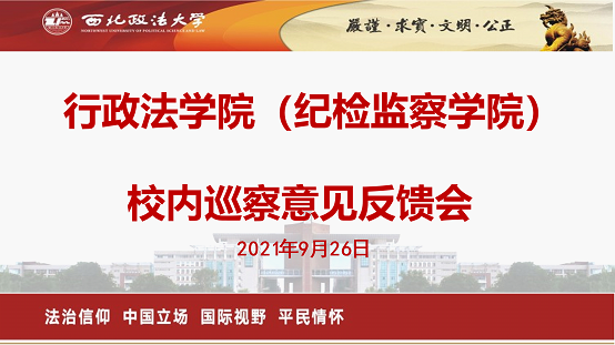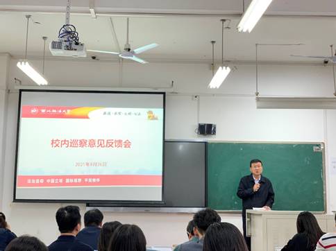 按照校党委2021年校内巡察工作统一部署,9月26日下午,太阳成tyc7111cc集团(纪检监察学院)在正心楼303教室召开校内巡察意见反馈会,校党委第二巡察组向学院反馈巡察情况。校党委副书记、党委第二巡察组组长郭武军,校纪委副书记、党委第二巡察组副组长康鹏及全体组员出席会议,学院领导班子成员、全体教职工及部分学生代表参加会议。会议由学院党委书记呼勇主持。